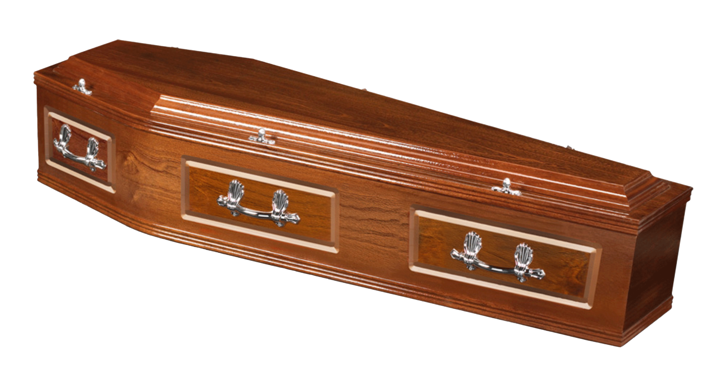 A traditional coffin with single bead moulding, finished in a light mahogany veneer.